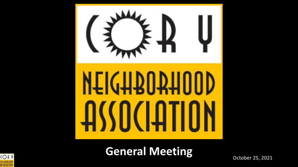 The Cory Neighborhood Association was formed in 2001 and has, through the years, built a strong relationship with the District 6 councilmember, which currently is Dev Davis. They attend our events and speak at our community meetings. That includes the current meetings we hold on Zoom.