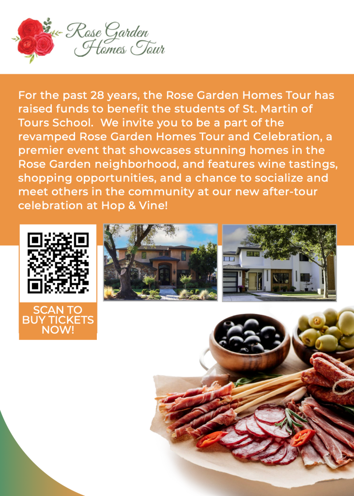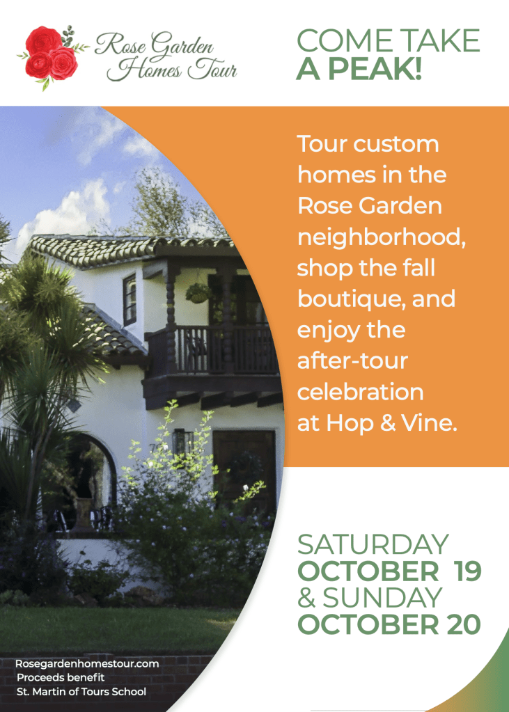 Our sister neighborhood has invited all of us to the Rose Garden Homes Tour on October 19th and 20th! It’s an annual event where you can explore some fantastic homes, browse unique shops, and taste wine all while raising money for the students of St. Martin of Tours School.
