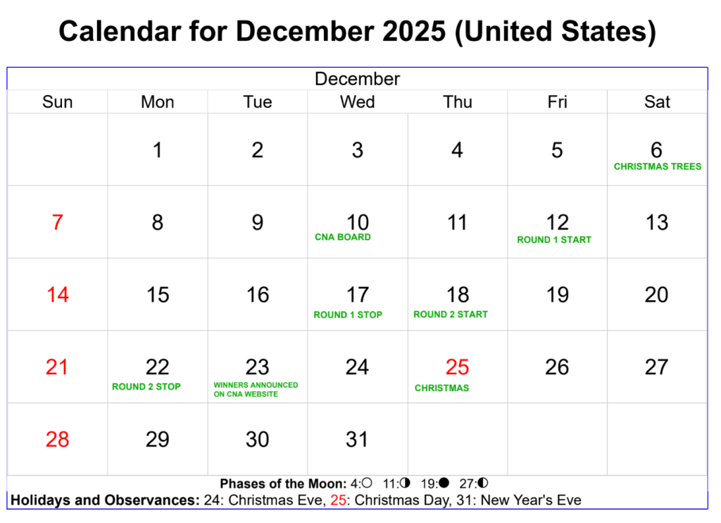 Any home in the CNA community may participate in the HS contest, by decorating the house and/or a tree during the HS timeline – registration is not required. The decorations should have a connection to Holidays of the season. The contest starts the Friday after the Christmas Tree delivery event. Since December dates fall on a different day of the week each year, the CNA
